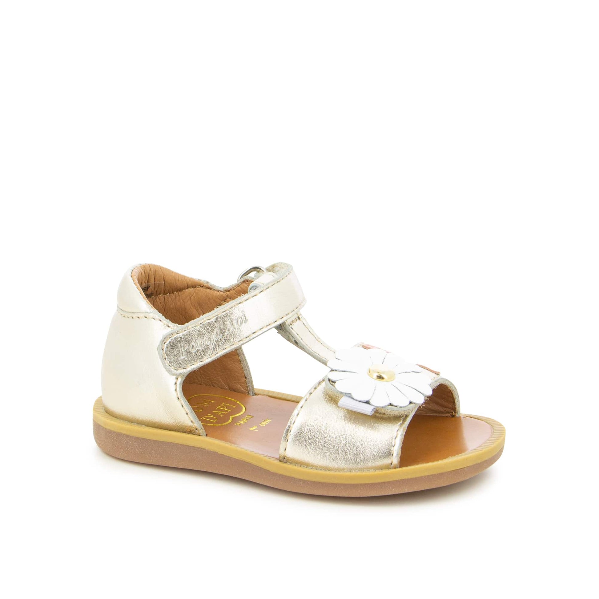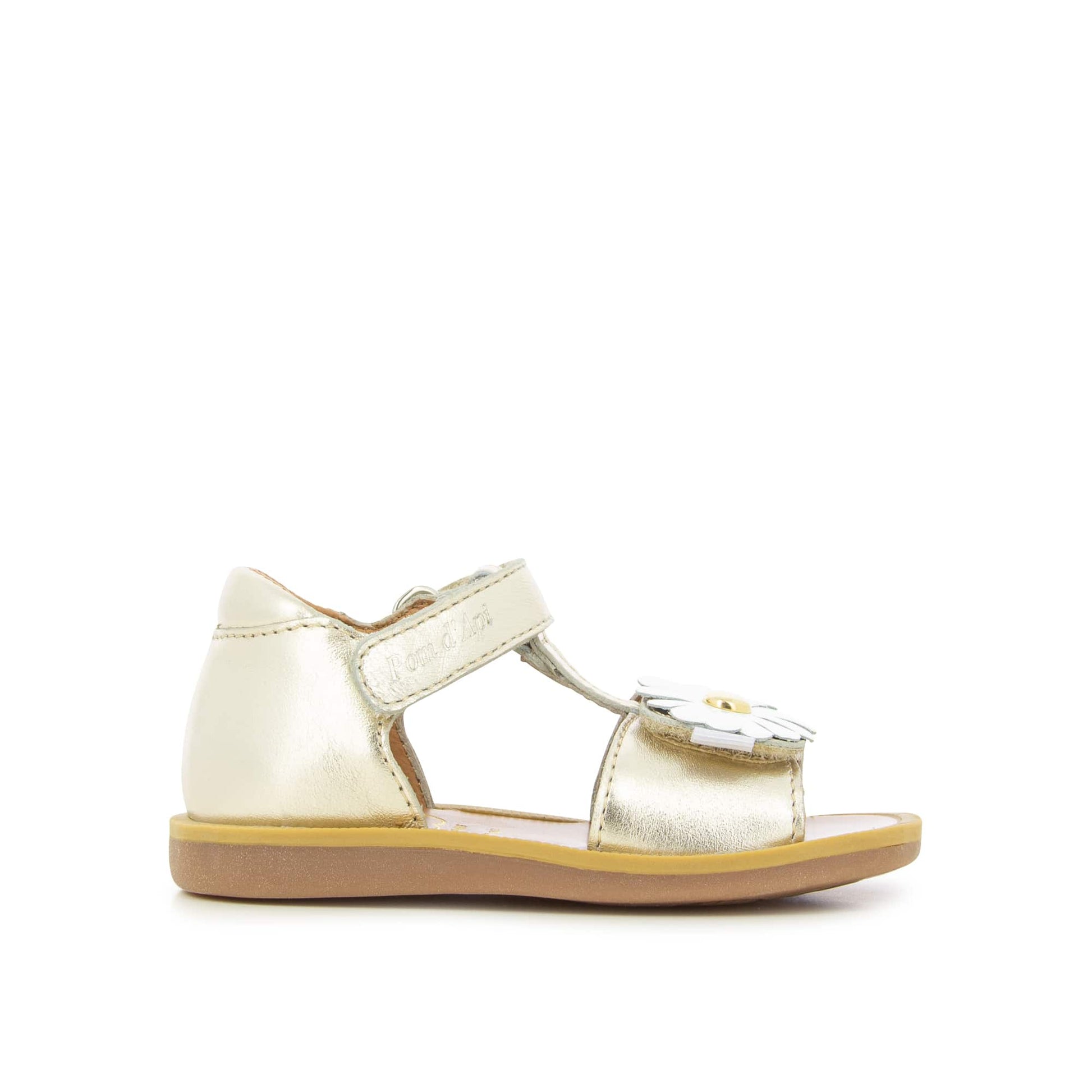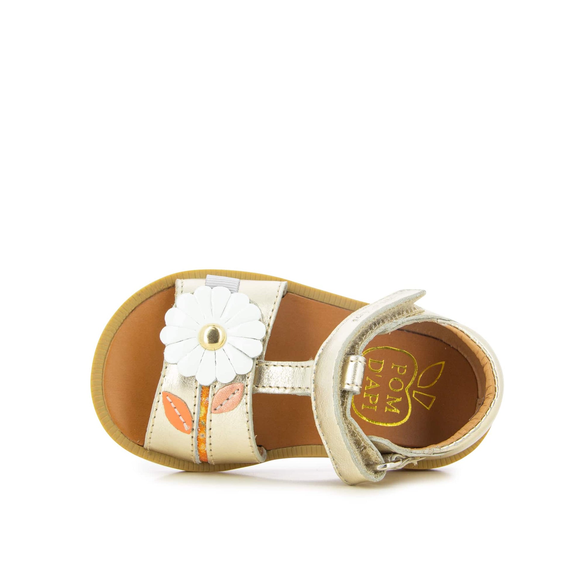Since 1870, Pom d’Api has been caring for little feet with passion. The Poppy Daisy sandals, crafted in shimmering metallic leather, bring a touch of magic to every step.With their practical Velcro® straps and delicate flower detail, they combine charm with ease of wear.The open round toe and soft leather lining wrap tiny feet in comfort, while the leather insole and flexible