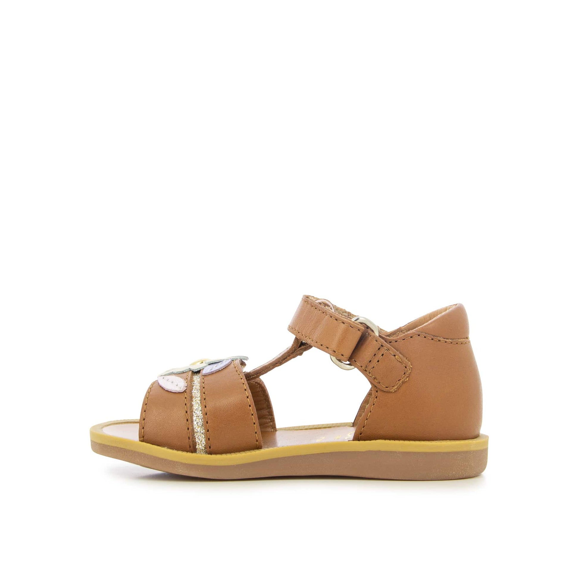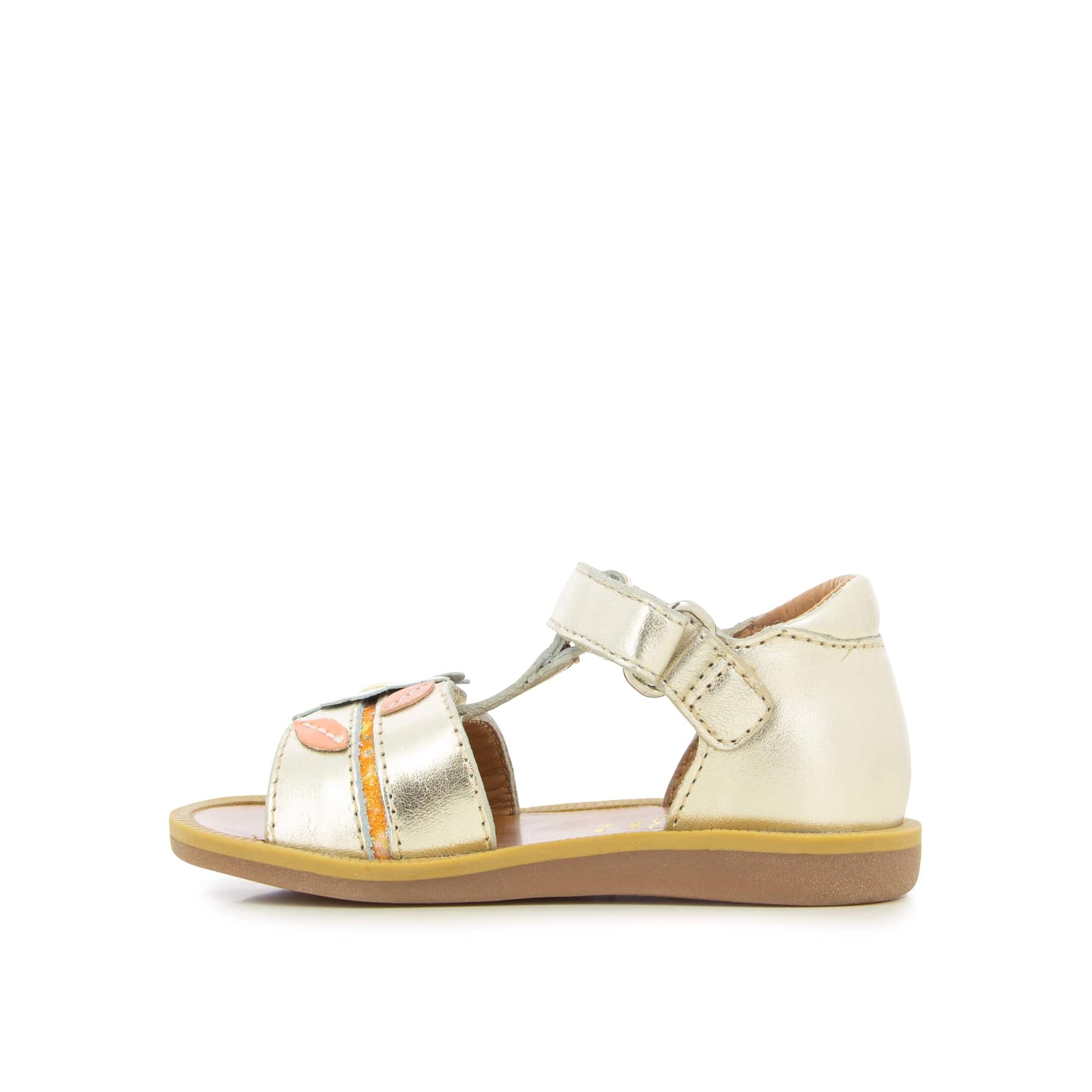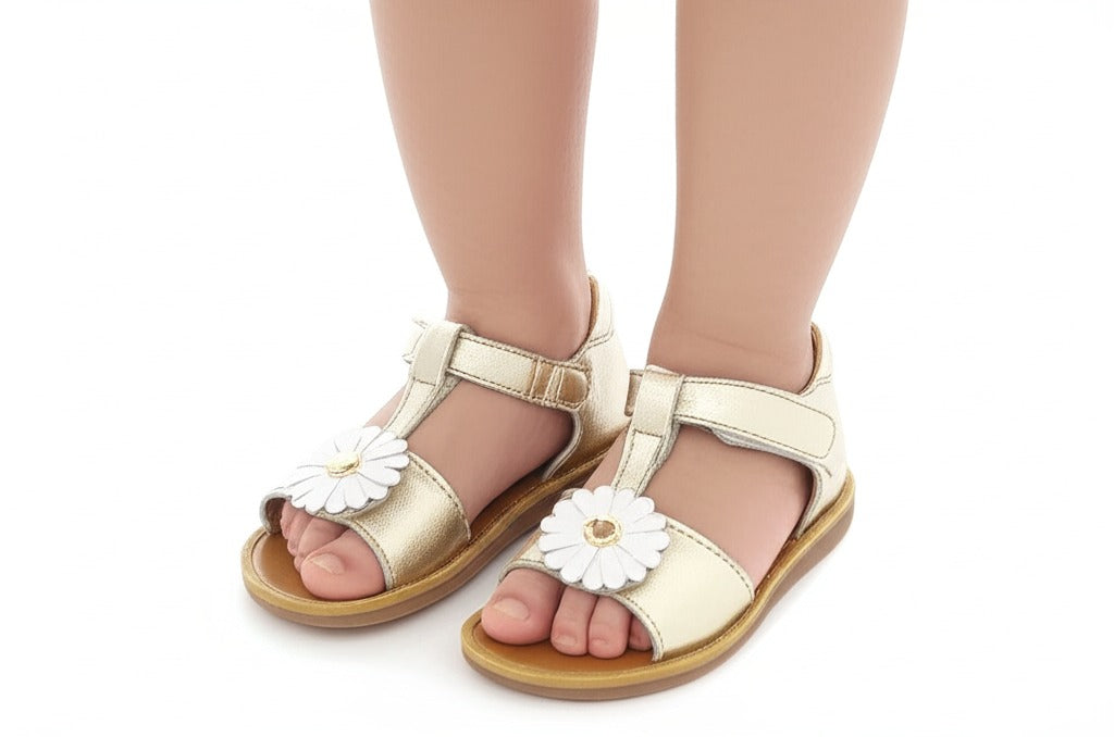 Since 1870, Pom d’Api has been caring for little feet with passion. The Poppy Daisy sandals, crafted in shimmering metallic leather, bring a touch of magic to every step.With their practical Velcro® straps and delicate flower detail, they combine charm with ease of wear.The open round toe and soft leather lining wrap tiny feet in comfort, while the leather insole and flexible